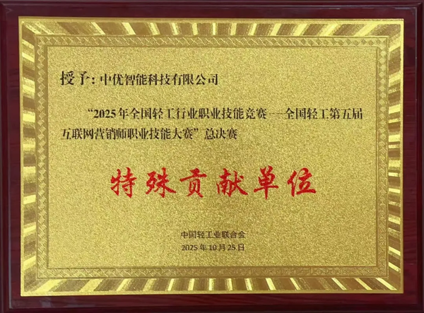 大赛总裁判长王瑶代表裁判组做大赛综合技术点评 实力护航大赛 AI驱动未来 作为本次大赛的AI技术支撑单位,中优智能科技有限公司为赛事提供了全面的技术保障服务,大赛创新引入AI工具作为考核内容,通过AI生成封面等先进技术提升视频转化效果,为参赛选手搭建了专业的技术支持平台。这一技术保障工作不仅确保了大赛的顺利开展,更体现了人工智能技术与互联网营销深度融合的未来趋势。 在大赛期间,中优智能提供的全方位AI技术支持有效保障了赛事进程,助力选手提升创作效率与内容质量,通过智能化工具实现营销内容的创新表达,充分展现了"科技服务产业"的核心理念。这一专业的技术保障工作获得了大赛组委会、参赛选手和行业专家的一致好评。 荣誉见证实力 责任鞭策前行 此次荣获“特殊贡献单位”,不仅是对中优为本届大赛提供AI全面技术支持的即时肯定,更是对公司自2024年成为轻工大赛战略合作企业以来,持续赋能轻工行业人才发展的长久认可。这份殊荣,承载着组委会的信任与行业的期待。